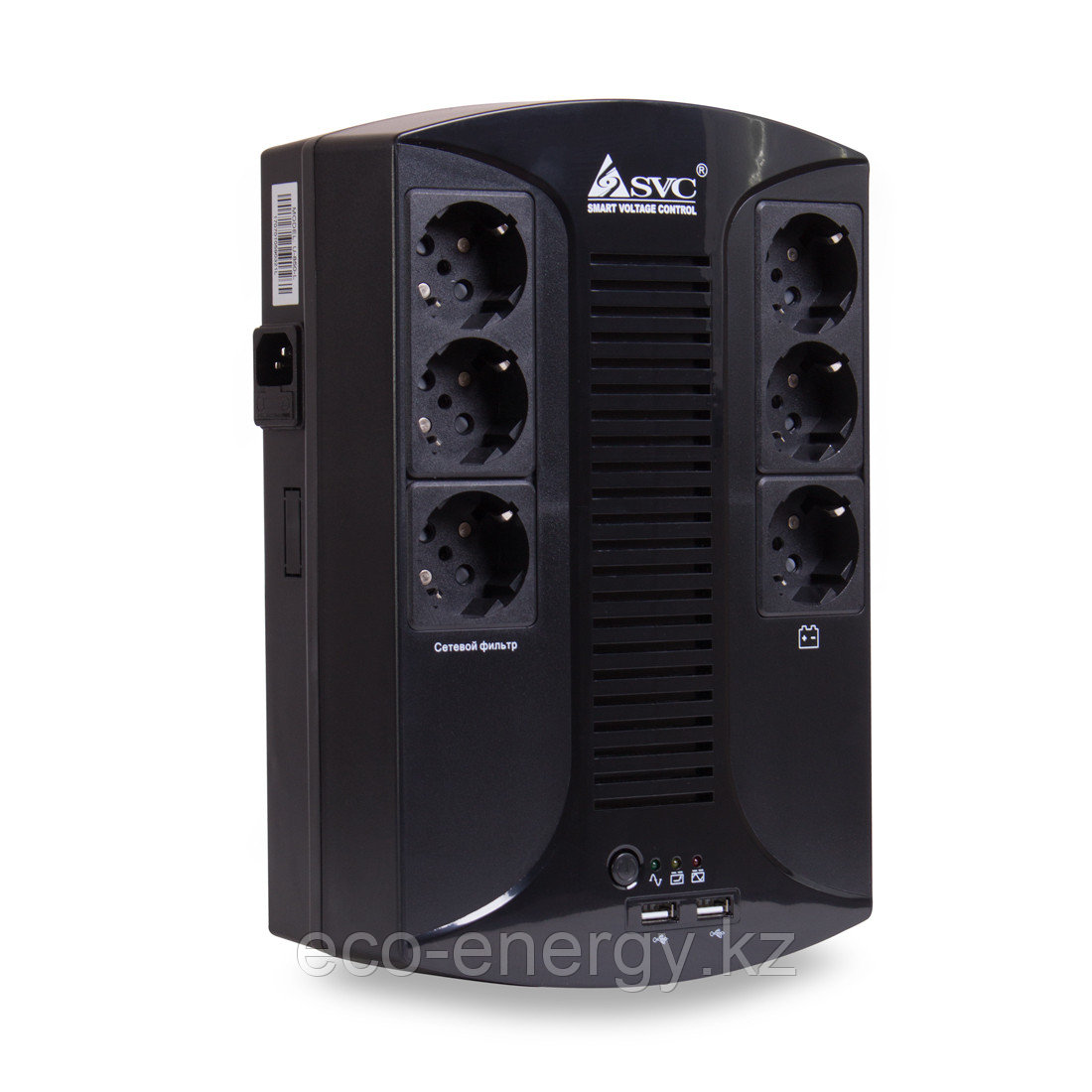 Линейно-Интерактивный ИБП с функцией сетевого фильтра SVC U-850-L Устройство, позволяющее подключённому оборудованию некоторое время работать от встроенных аккумуляторов, при пропадании электрического тока или при выходе его параметров за допустимые нормы. 3 выходных разъёмов Shuko CEE7 с батарейной поддержкой и 3 выходных разъёмов с функцией сетевого фильтра позволят подключить большое количество оборудования. 2*USB порта 5В/2А позволят зарядить любое портативное устройство.